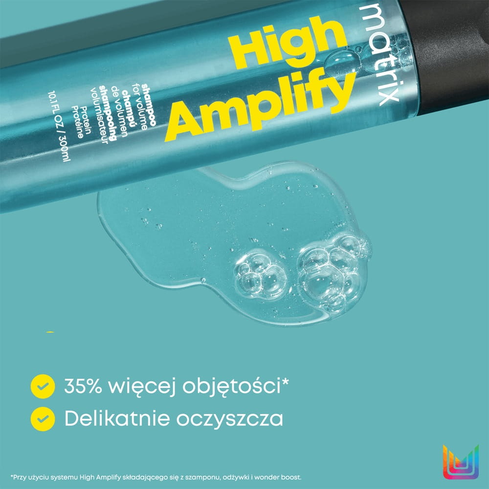 Zaaplikuj na wilgotne włosy. Wmasuj do powstania piany. Spłucz i następnie nałóż odżywkę High Amplify.